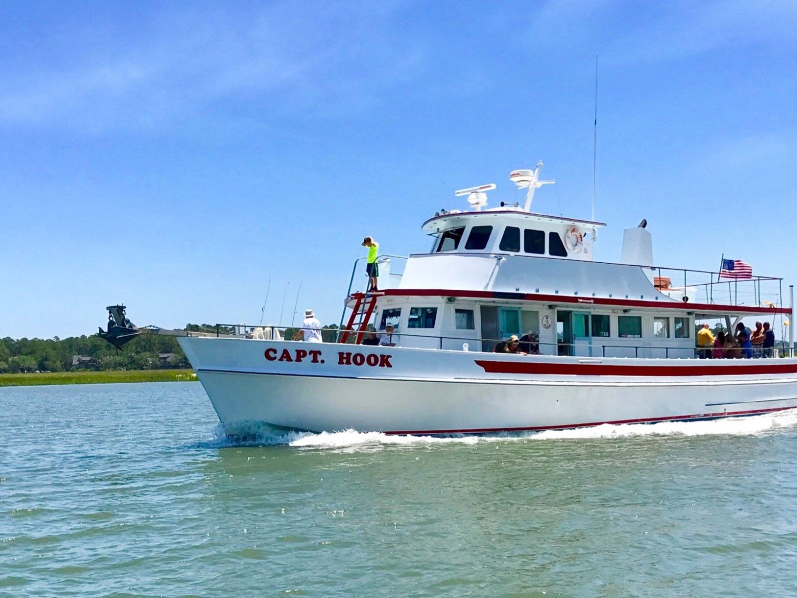 The Capt. Hook is the largest and most comfortable party fishing boat on Hilton Head Island, allowing us to take multiple groups at a time. We strive to provide you with the best service while enjoying the waters of Hilton Head’s Lowcountry. The company and boat are family-owned and operated. The boat is U.S. Coast Guard approved and inspected and has the following features: